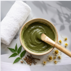 ✔ 1 cucharada de neem / 1 cucharada de Multani Mitti / Agua tibia e hidrolato. Mezclar, aplicar 15 min y enjuagar.